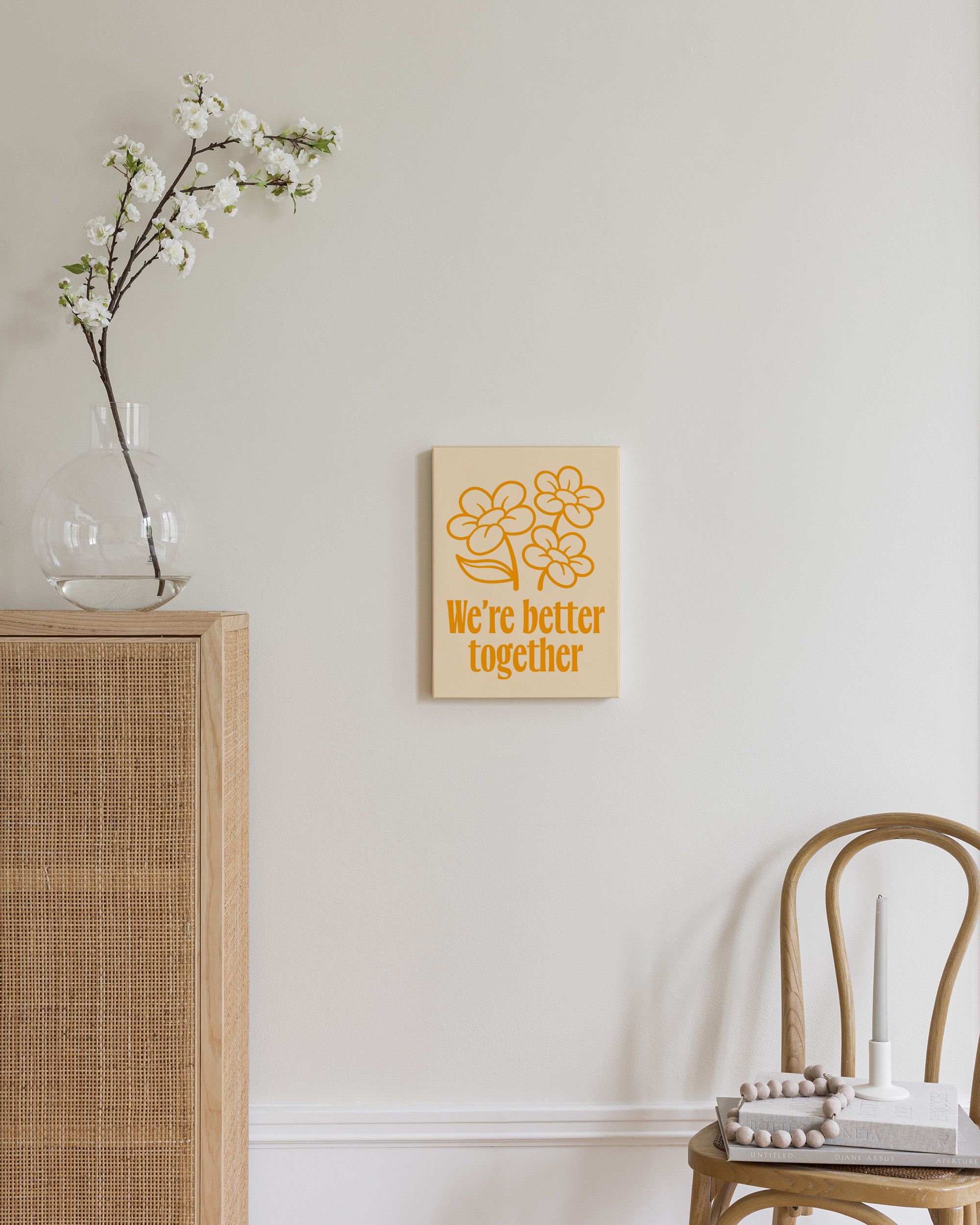 Od 220,50 KčMinimalistický obraz na plátně znázorňující tři oranžové květiny na béžovém pozadí. S nápisem "We're better together" v oranžové barvě. Roztomilý a jednoduchý.