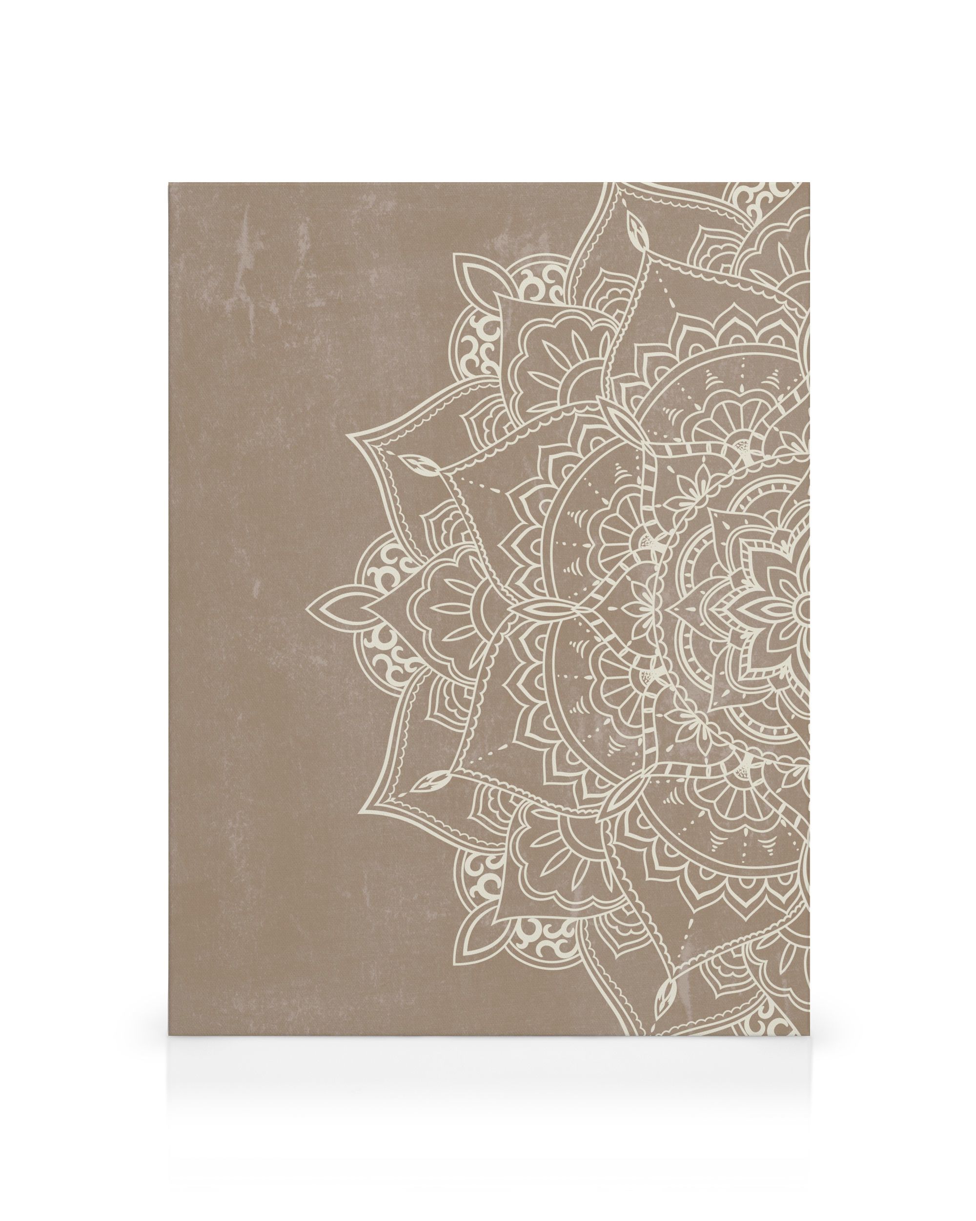 Krásná bílá mandala s jemnými květinovými vzory na béžovém pozadí. Dokonalá dekorace do vašeho pokoje.