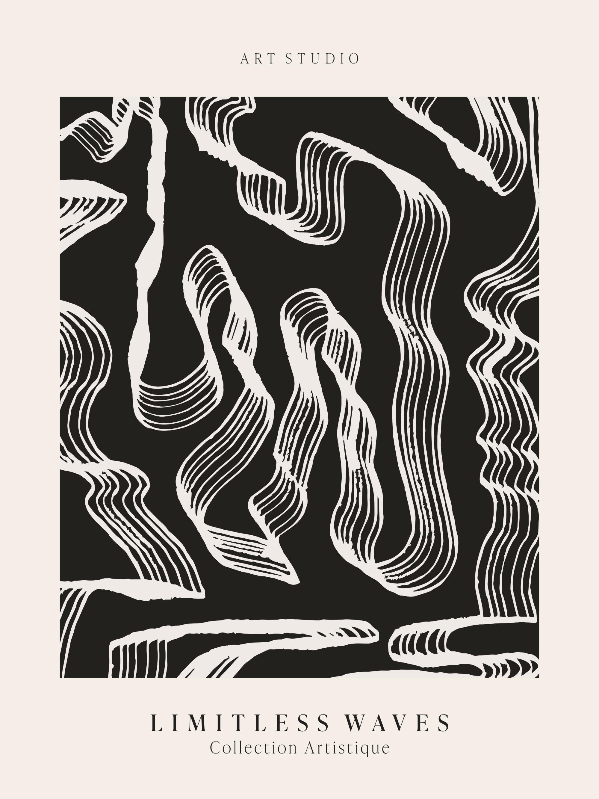 Abstraktní umění s abstraktní ilustrací se zatočenými tvary na černém a béžovém pozadí, s textem nahoře a dole. Udělejte svůj domov modernějším pomocí abstraktních plakátů!