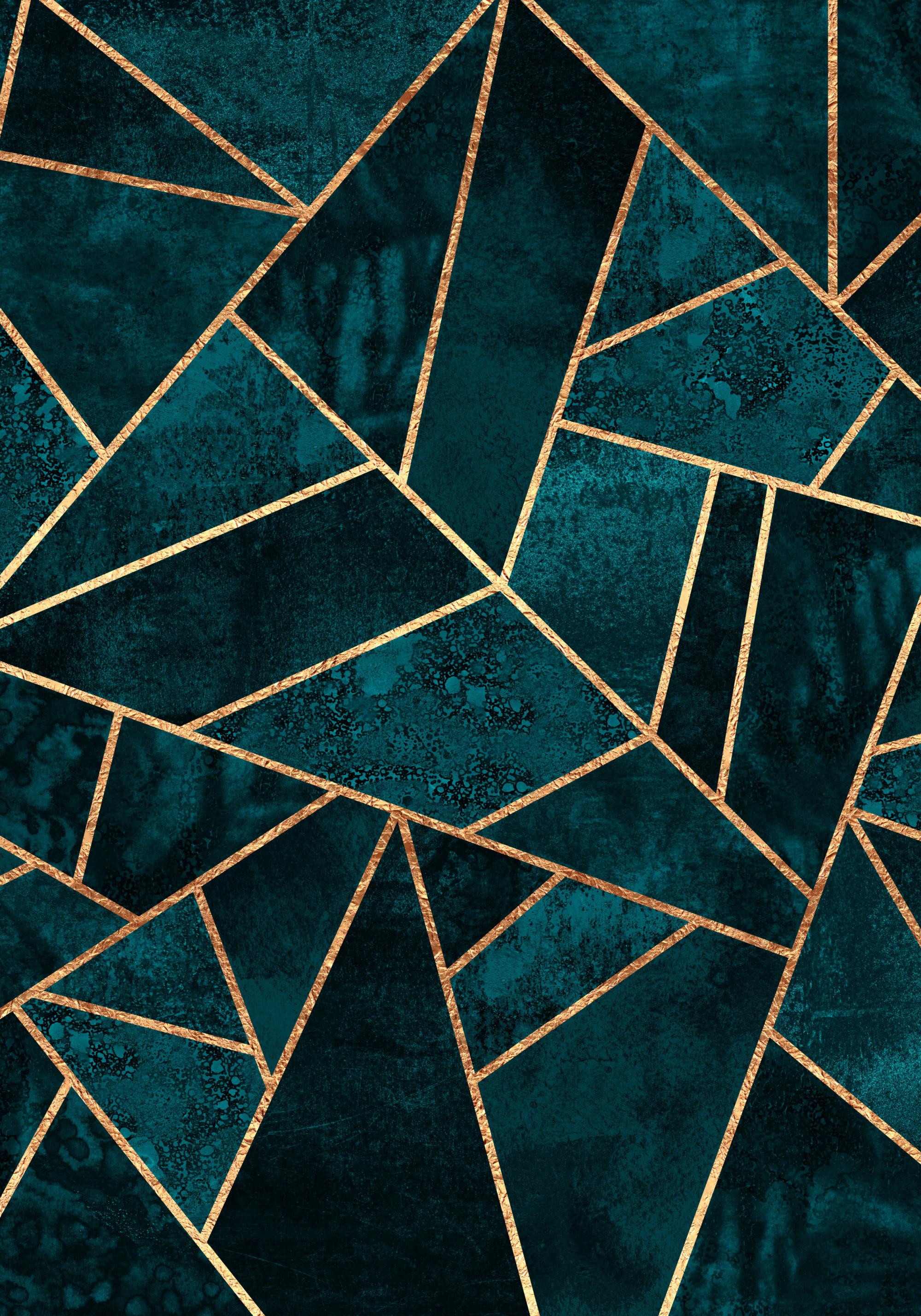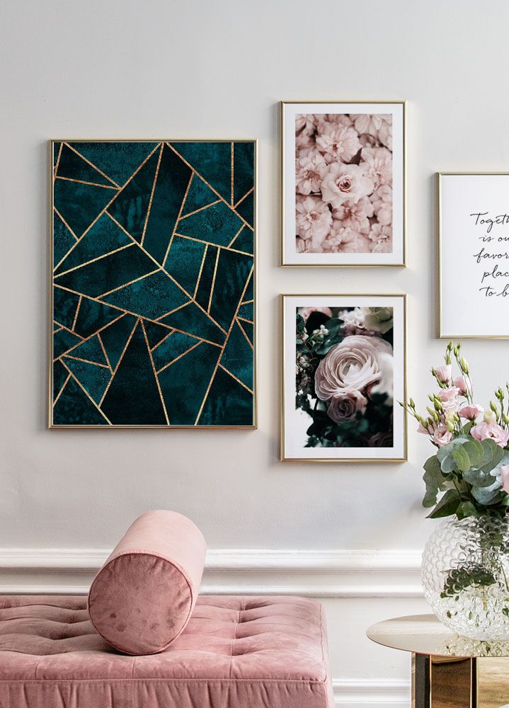 Grafický plakát s motivy zelenomodrého vzoru a elegantními zlatými linkami. Obraz vypadá skvěle sám o sobě, ale zároveň i v kombinaci s dalšími obrázky kolem.