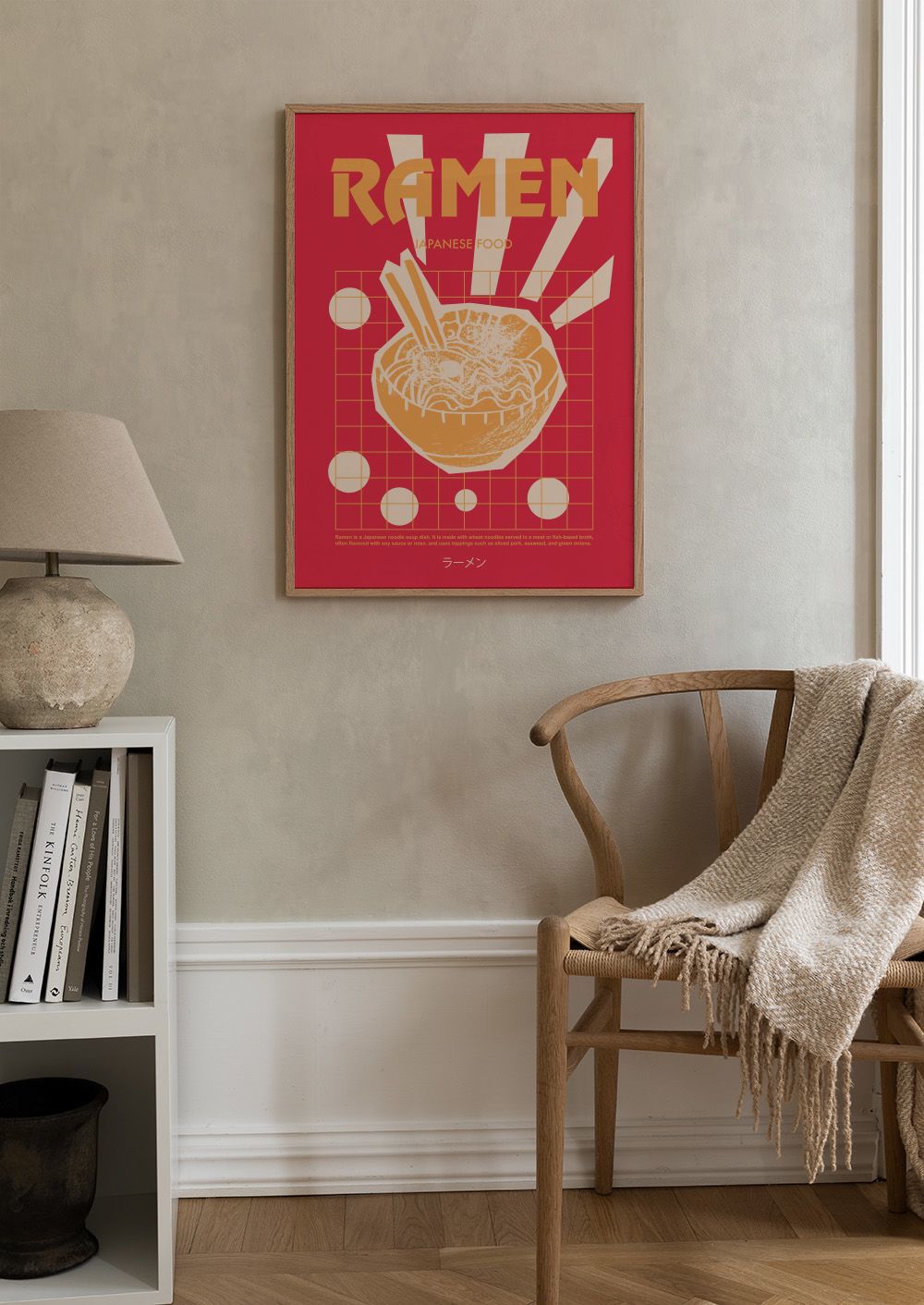 Červený plakát s nápisem "RAMEN" ve žlutých písmenech. Pod ním je miska s nudlemi a hůlkami. Jednoduchý a barevný.
