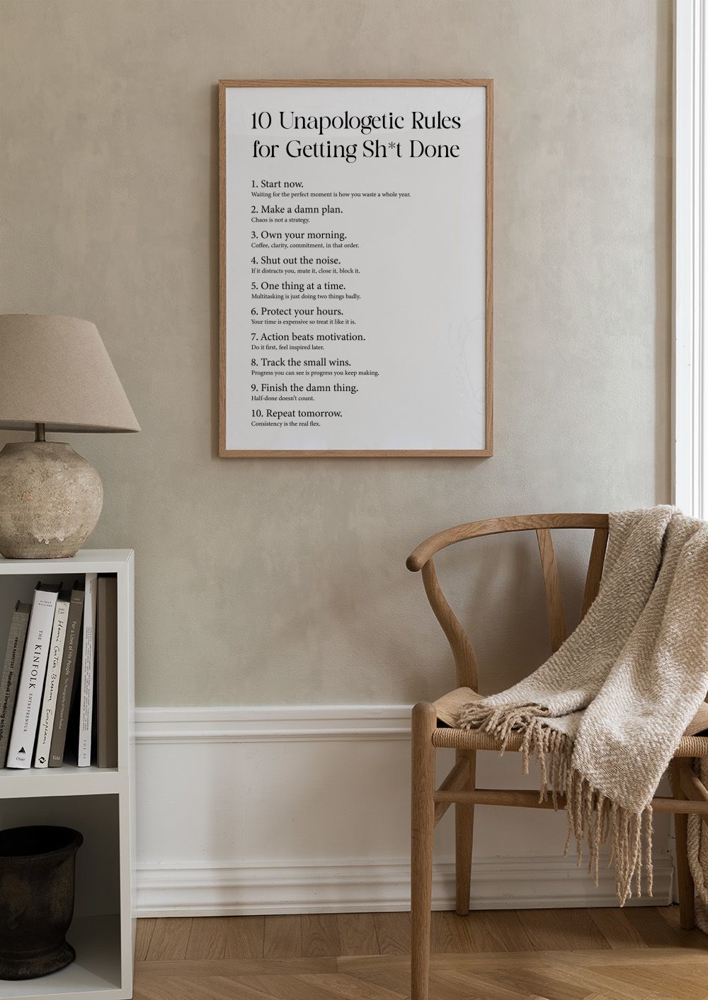 Motivační poster s 10 nekompromisními pravidly pro dokončování úkolů. Černý text na bílém pozadí. Perfektní nástěnná dekorace, která vás udrží soustředěné a produktivní!