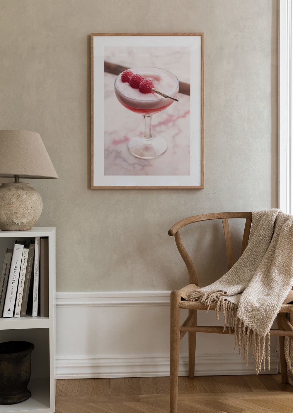 Plakát s růžovým koktejlem ozdobeným malinami. Osvěží každou stěnu svou jemnou růžovou barvou a letní atmosférou.