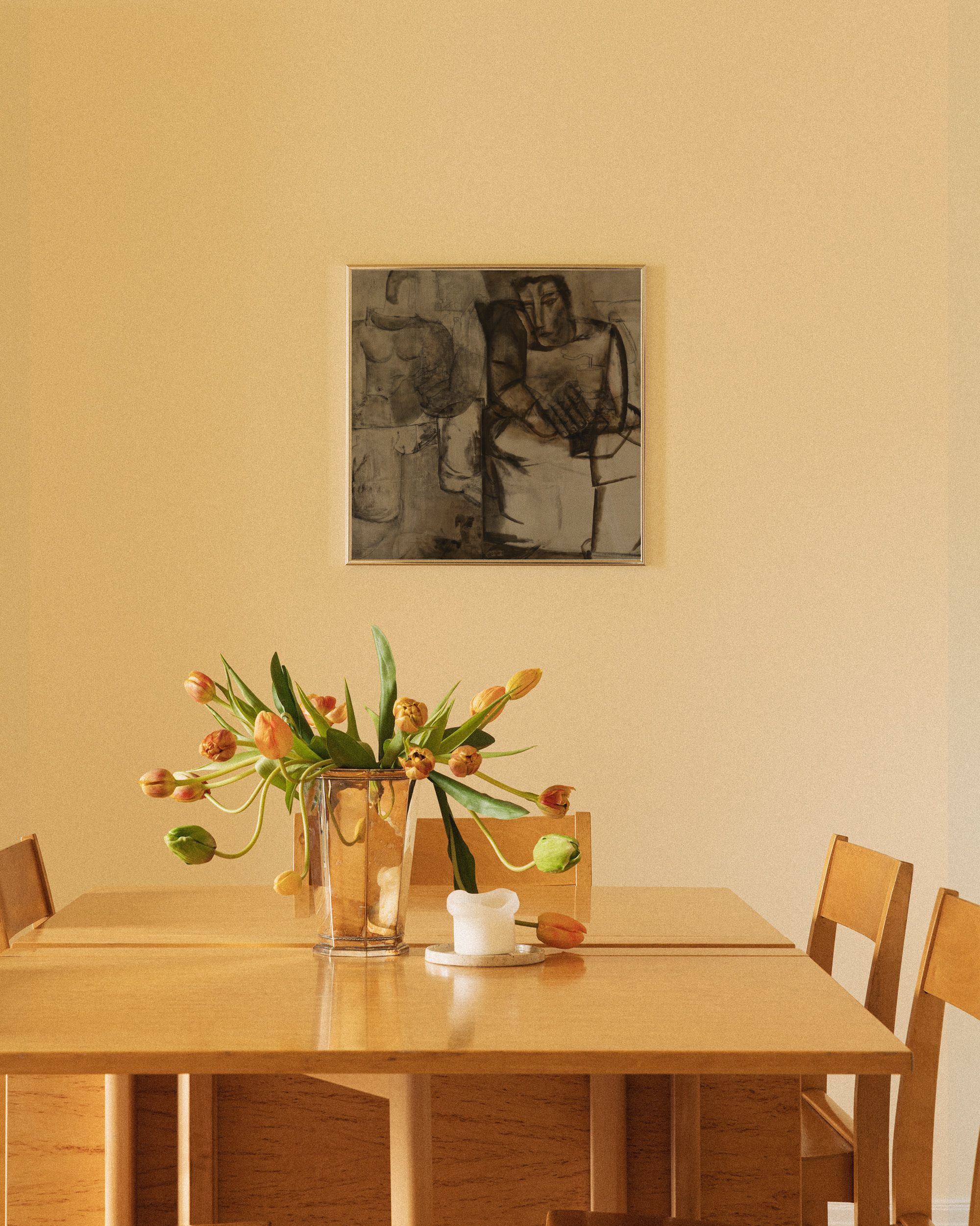 Plakát s osobou držící šálek s brčkem. Obraz v hnědých a béžových tónech s abstraktními tvary a malým psem. Hrubé textury a tmavé linie.