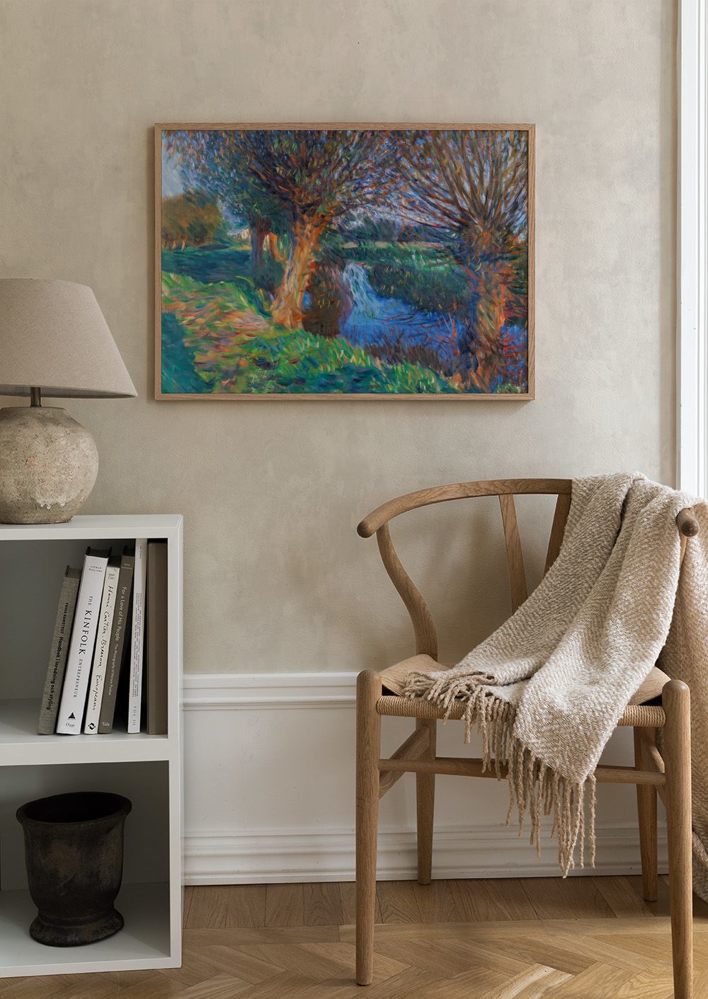 Živá krajina s vysokými stromy a modrým potokem. Zelená tráva s oranžovými a žlutými skvrnami. Jasné barvy a viditelné tahy štětcem.
