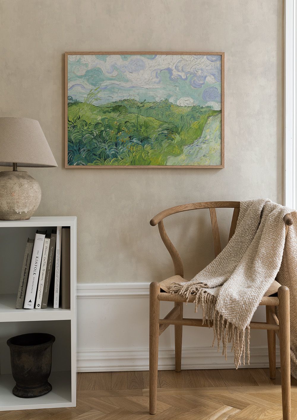 Zelené kopce s vírovými vzory a žluté květy vytváří živou krajinu. Světle modrá obloha se točivými mraky dodává plakátu energii a radost.