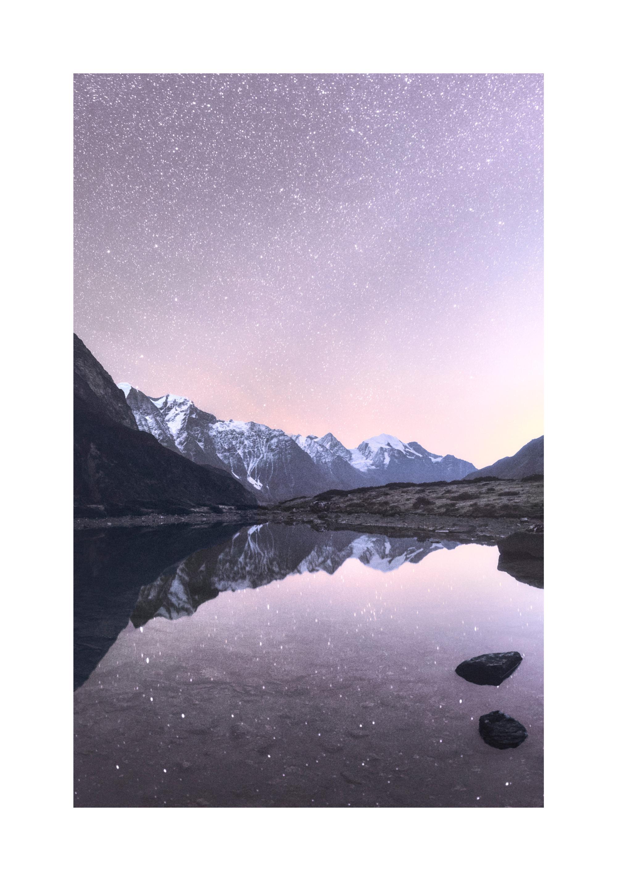 Od 409,50 KčNádherný plakát přírody s nejvyšším pohoří na světě, Himaláje. Na fialové obloze se třpytí hvězdy a ve vodě se odrážejí zasněžené vrcholky hor.