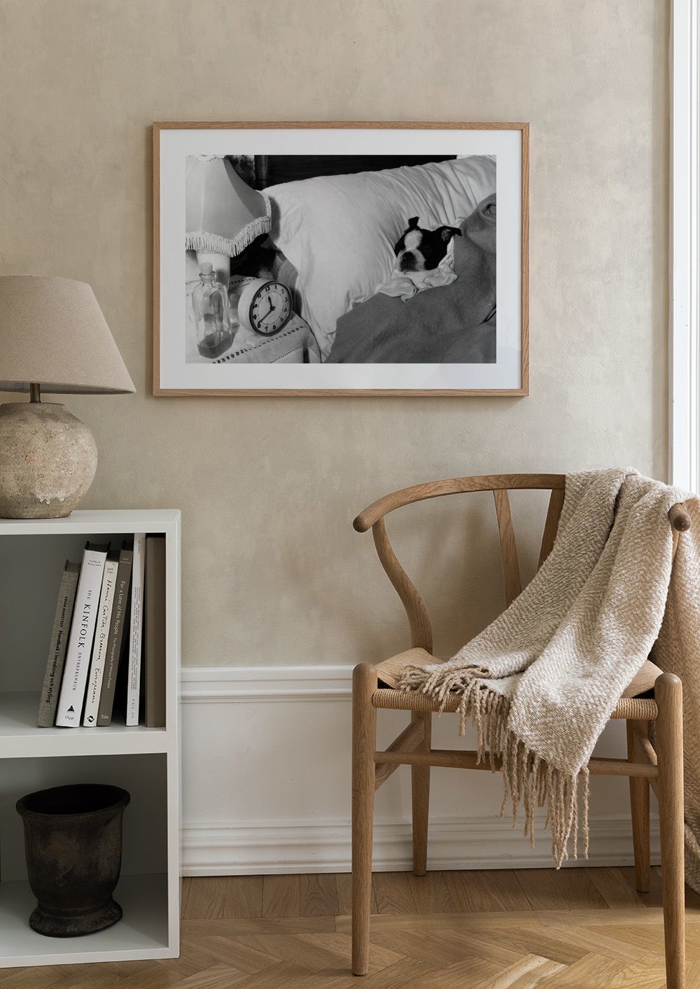 Roztomilý pejsek spí v posteli s polštářem a dekou. Vedle stojí lampička a hodiny. Černobílý plakát pro milovníky psů.