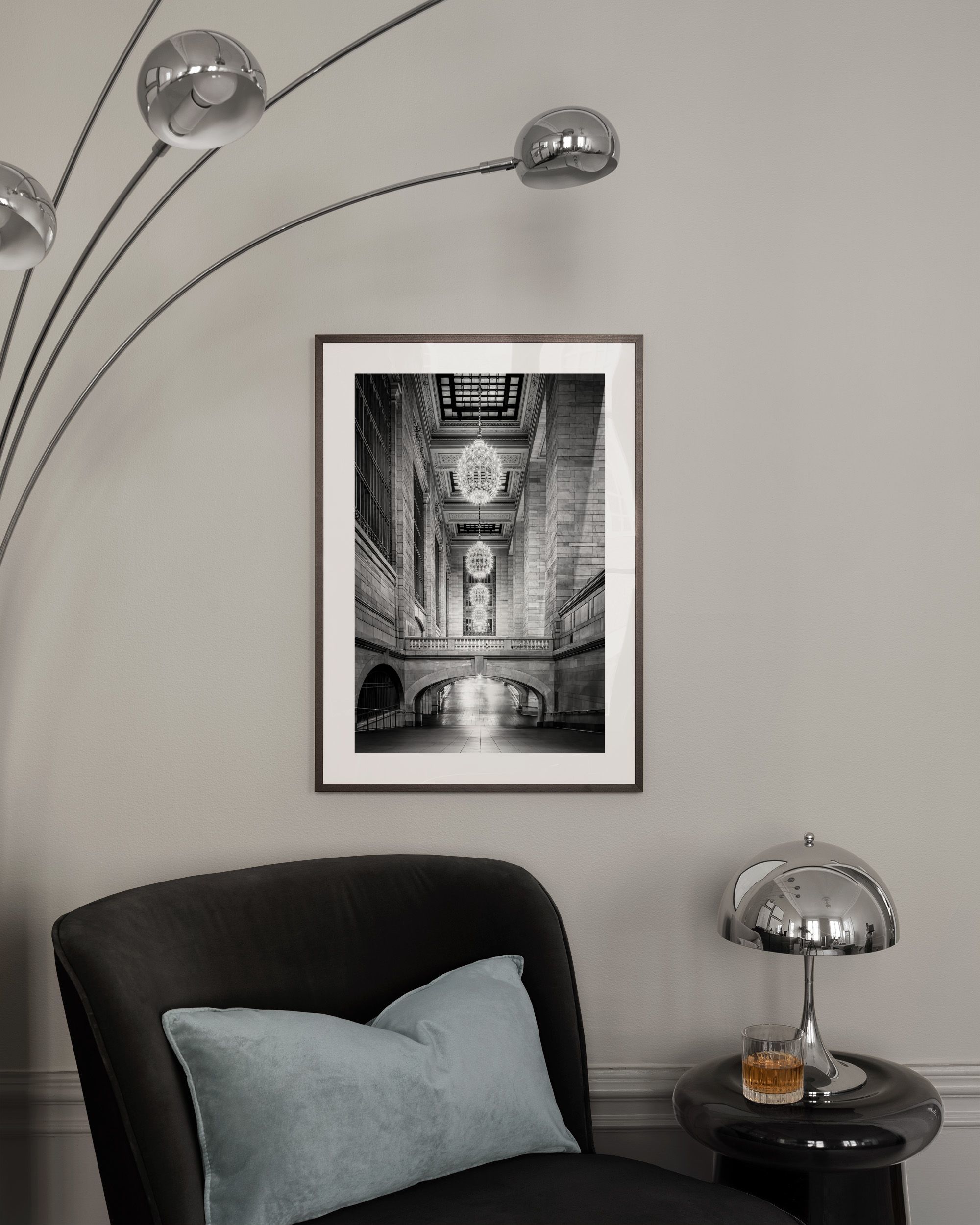 Černobílý obraz velkolepé haly s vysokými stropy a ozdobnými lustry. Elegantní prostor s nádhernými vzory a lesklou podlahou vytvoří ve vašem pokoji jedinečnou atmosféru.