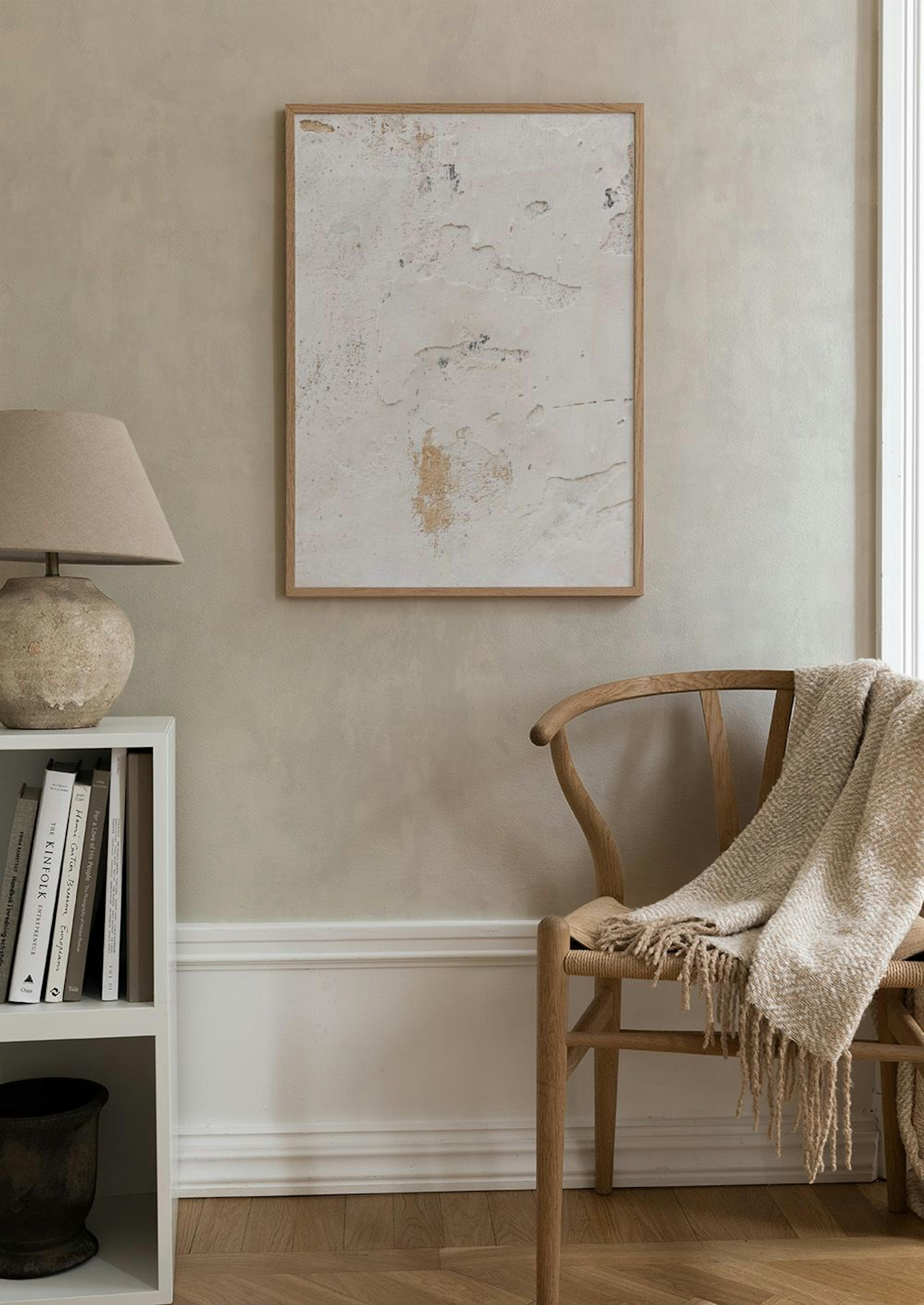 Plakát ukazuje starou betonovou zeď s hnědými a šedými skvrnami. Barva se odlupuje a jsou na ní praskliny. Působí drsně a surově.