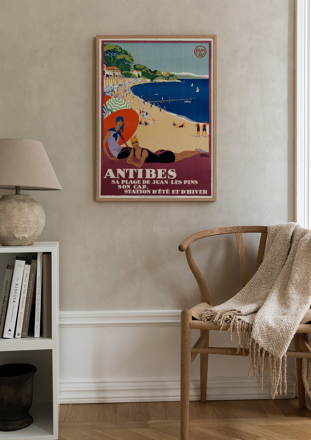 Barevný plakát s plážovou scénou z Antibes. Dvě ženy v plavkách odpočívají na písku u modrého moře. Živá letní atmosféra s čluny a slunečníky.