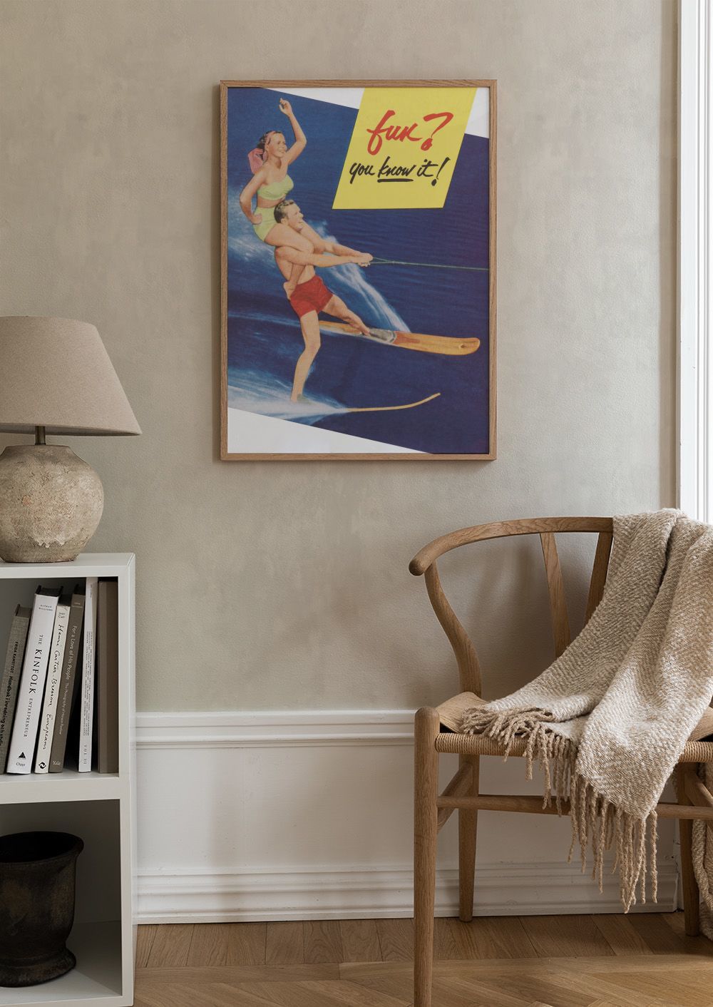 Zábavný retro plakát s vodním lyžařem a ženou v zeleném plavkách. Modré vody a barevné detaily dodají tvému pokoji veselou atmosféru plnou letní zábavy.