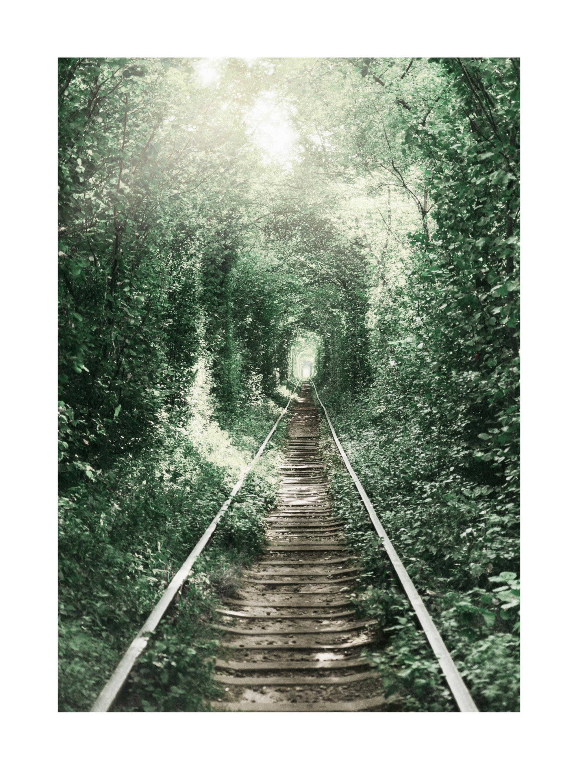 Plakát romantické přírody v hustě zarostlé železniční trati. „Tunel lásky“ je ukrytý v lesích vesnice Klewan na Ukrajině.